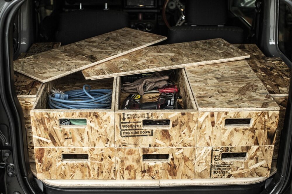 工具を収納する棚はJB64に合わせてティープラスターが製作したワンオフ。物流過程で発生したOSB材を使用したエコなプロダクツである。棚は愛車のラゲッジスペースに合わせて、箱のサイズや段数を指定するフルオーダーが可能だ。