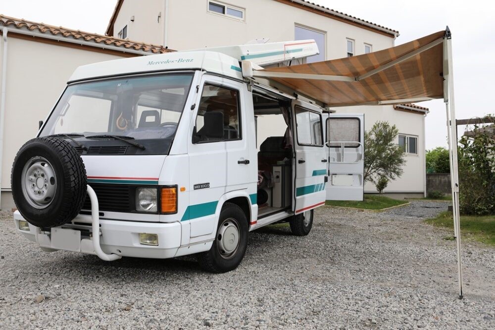 サイドには純正のオーニングが装備されており、野外のイベントでも大活躍。これを利用してイベントを行うこともある。またルーフ部分がポップアップテントになっており、複数で就寝することも可能。ファミリーキャンプでも難なく使える広さがあるそう。