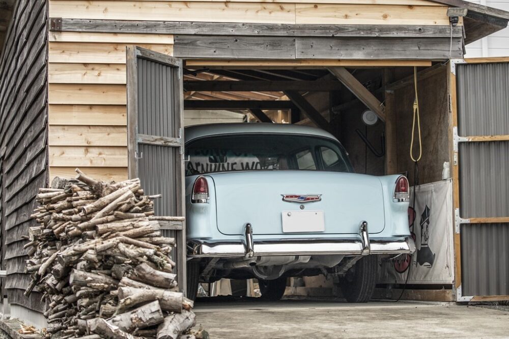普段’55年210が格納されている場所は、自宅横にセルフビルドしている最中の木造ガレージ。クラシカルな世界観が貫かれている。