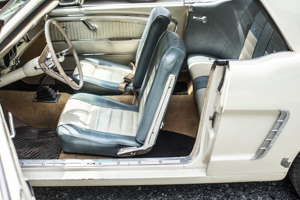 ブルー×ホワイトの2トーンのシートは、もう一台所有するパーツ取りのマスタングから移植。ハーストのシフターは独特の操作感が魅力だ。