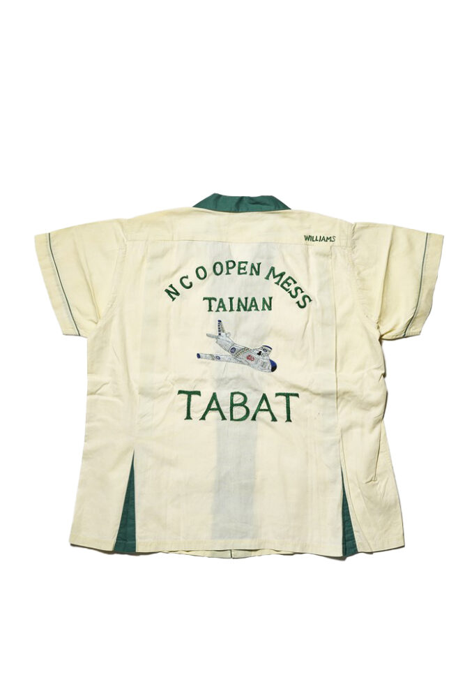 コットン製。白をベースに襟や前立て、背面裾のプリーツ、胸ポケにグリーンを使用。胸のワッペンと背中の戦闘機、TAINANという刺繍から朝鮮戦争時代に台湾に駐留した兵士のスーベニアだと思われる。3万2780円