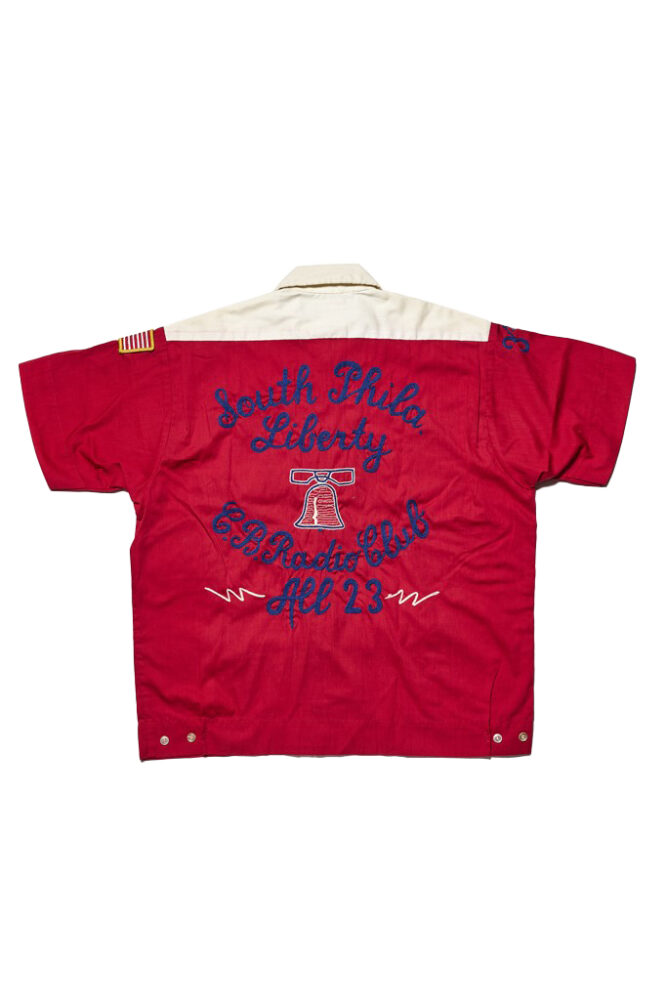 コットン製の赤いボディに襟周りが白の切り替え。フロントボタンが見えな仕様に。背面はフィラデルフィアを代表するリバティベルと電波のようなイラストから無線クラブのメンバーで作ったものと思われる。3万8280円