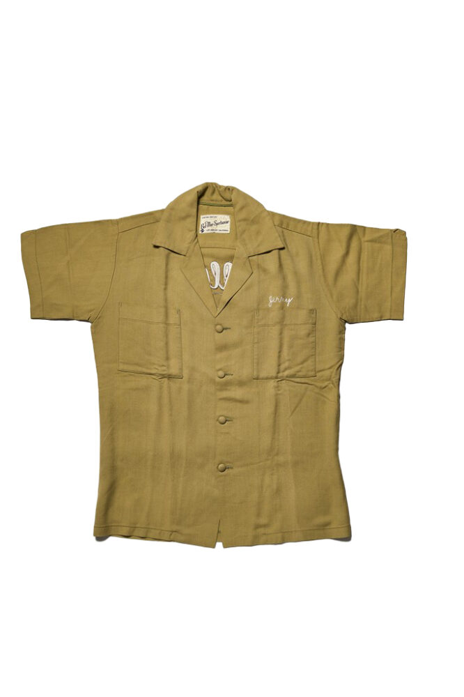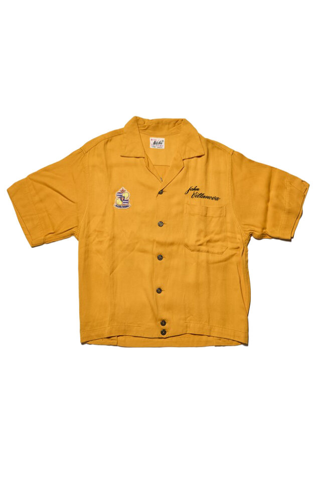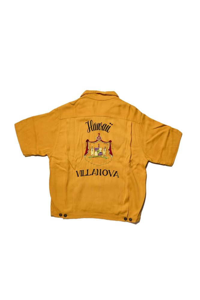 ハワイで作られたレアなボウリングシャツ。レーヨン生地のキャメルカラーのワントーン。背中には文字とホノルル市の市章の刺繍。フロントは銭ボタンと呼ばれる昔の通貨のような銅製のボタンが付く。8万5800円