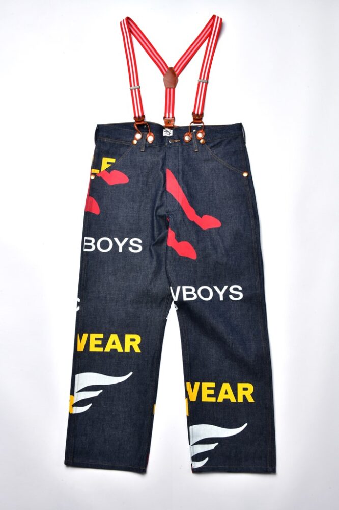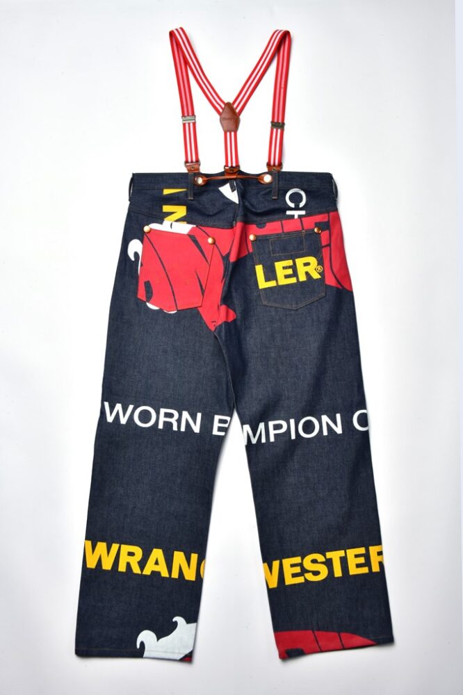 デニムジャケット同様、こちらもデニムバナーでラングラーの原点である5Pジーンズ「11MW」をリメイク。サスペンダーボタンがあり、別売りのサスペンダーを使ってオーバーサイズの着こなしも楽しめる。刺繍タグと75周年記念タグ付。※サスペンダーは別売り 4950円