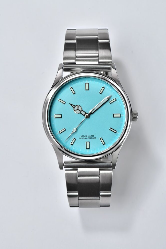 150本限定でリリースされるアティースの新作腕時計。ベルトは3連ブレスかレザーバンドから選択可能だ。ダイアルカラーはこれからの季節にピッタリなターコイズブルーの他に、ブラックとホワイトをラインナップ。