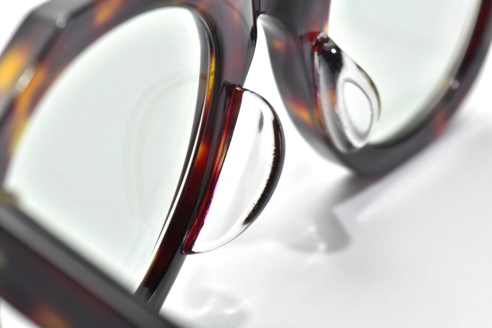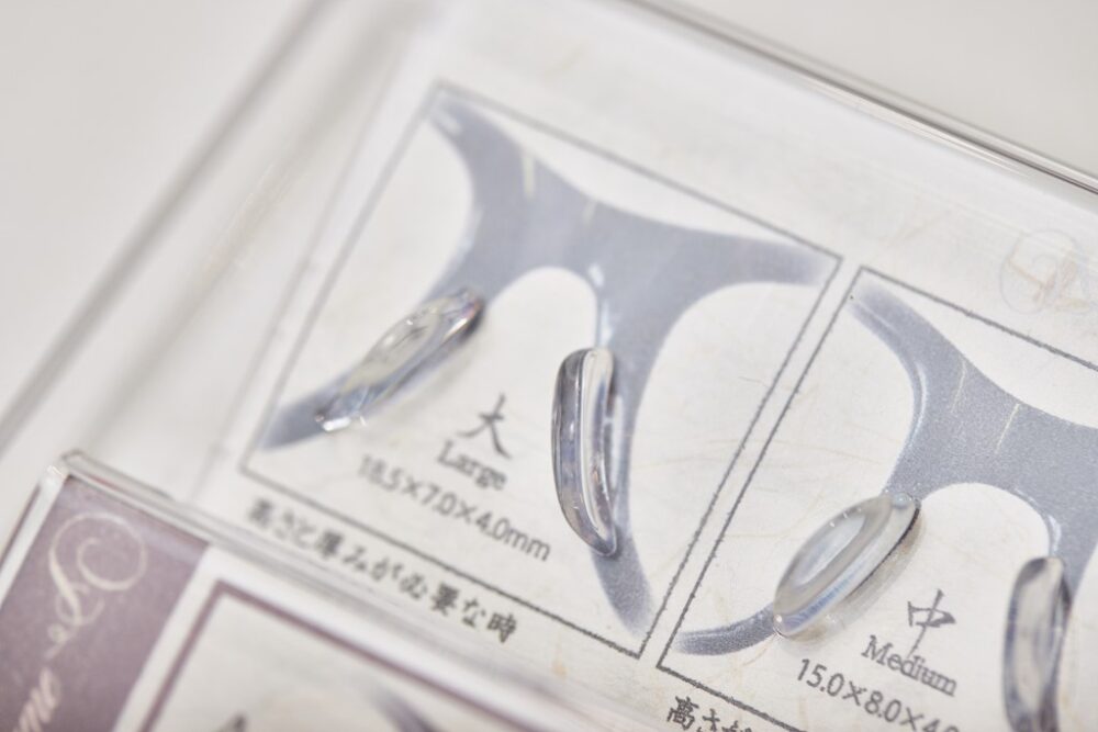 以前から所有しているguepardというブランドのクラウンパントが、夏場になると汗で滑るので鼻パッドを大きく変更したいという相談。元々のものを切り落とし、新たに大きいものを付けてくれるそう。