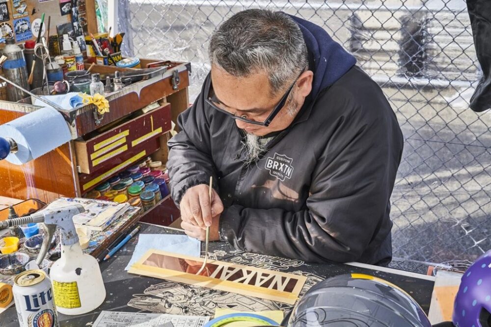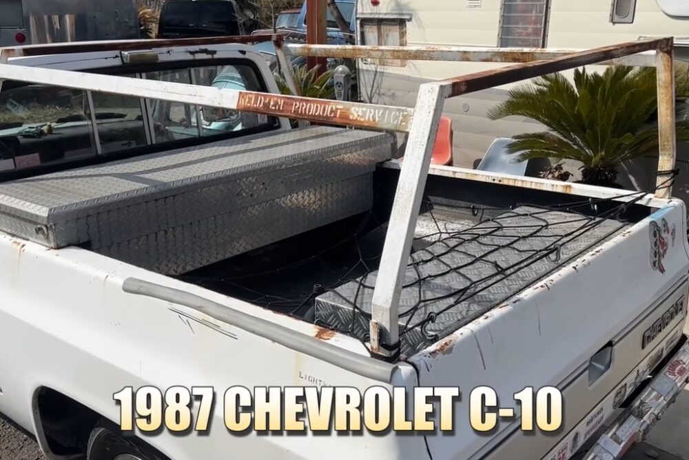 フリーハンドで看板やクルマなどにレタリングやピンストライプを描いているピンストライパーのケンザフラットトップさんの愛車は、仕事もプライベートもいっしょだという1987年式シボレーC10ピックアップ。