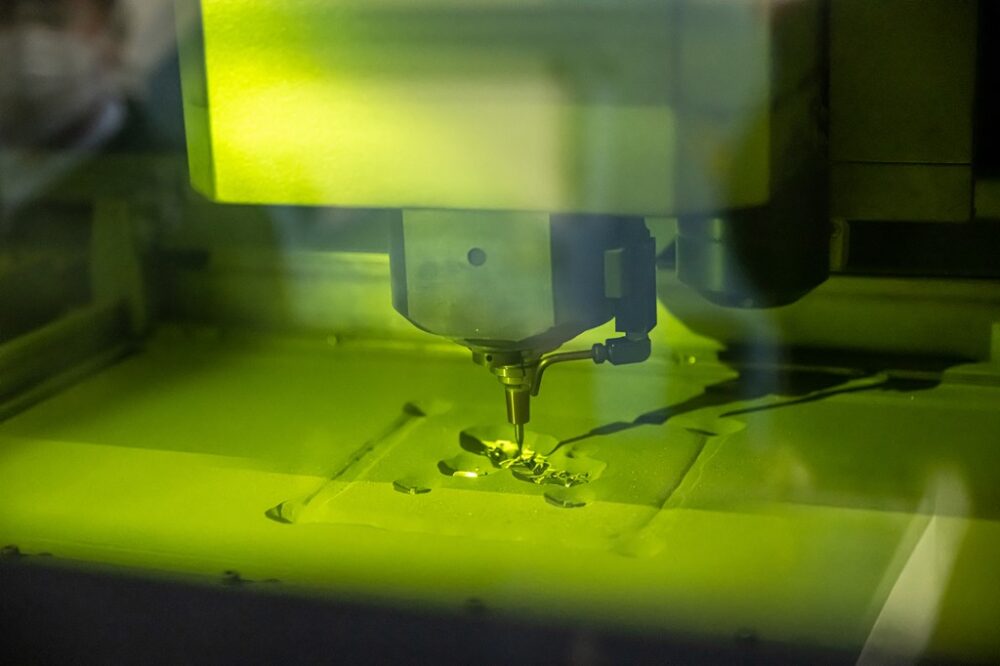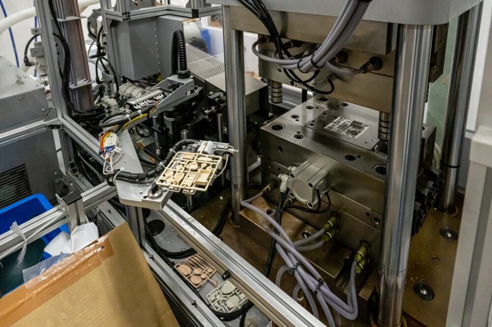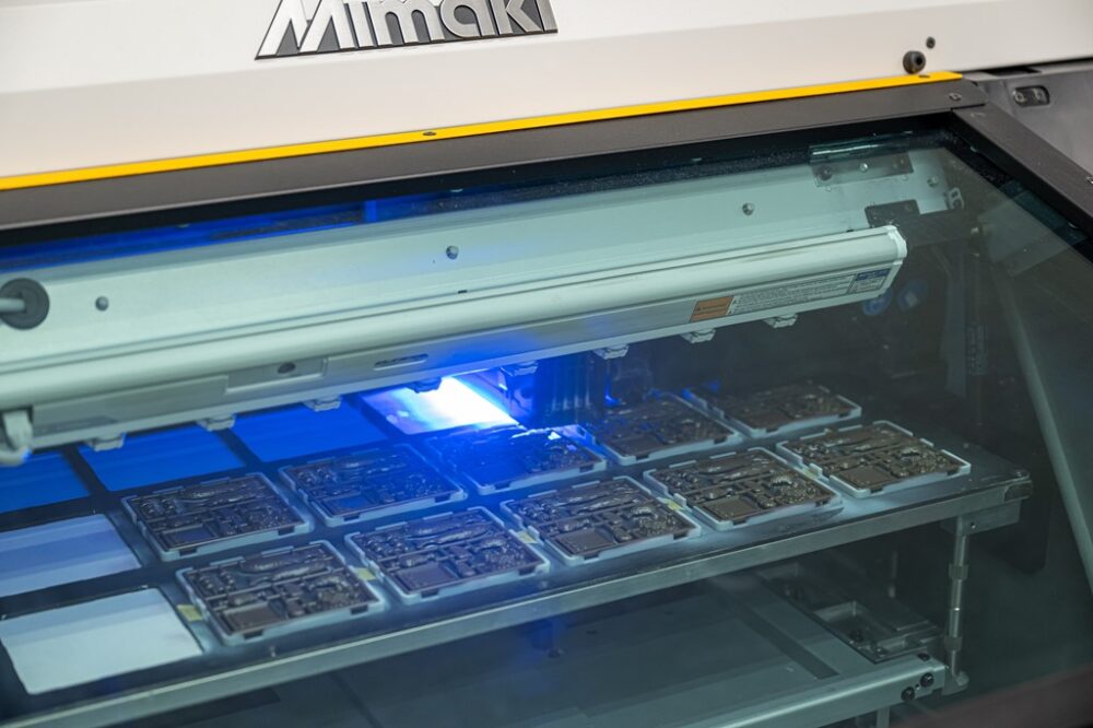 デジタル技術を用いると生産工程のコンパクト化が計れる。PCでデザインし、3D金属プリンターで金型を作成、そこに樹脂を流し込んで成型し、インクジェットプリンターで印刷するという全工程を、MiCはひとつの生産工場に集約させている。