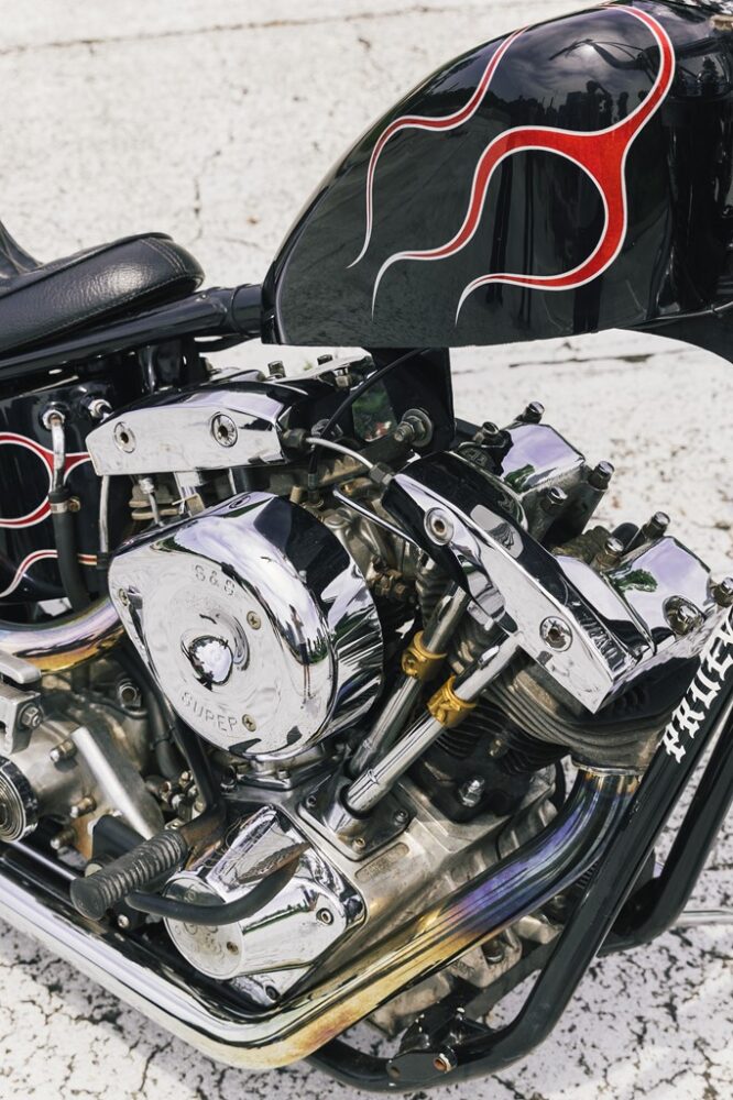デルクロンケースを採用した’78年式ショベル。カバー類のエングレイビングや真鍮のプッシュロッドカバーなど、外観もカスタムされている。