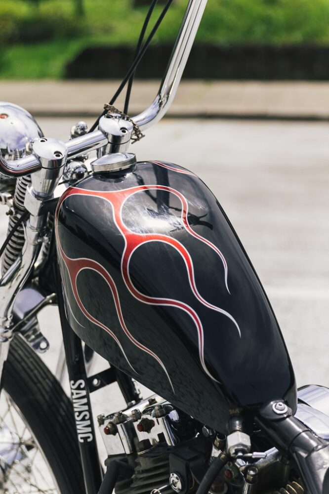 ガソリン容量を稼ぐために給油口を高い位置に移設したスポーツスタータンクをハイマウント。細いフレイムスのペイントはSAMSのお家芸。