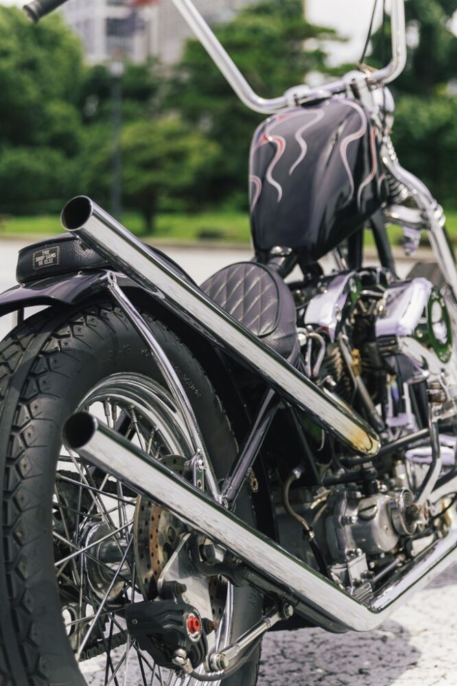ルーツをボバーに持つアップスウィープだが、エキパイから一本のパイプで長めに作ることでチョッパーらしいデザインに。タンデムは想定していない様子。