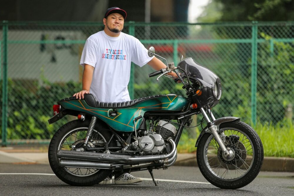 アメリカ西海岸のオモチャやモーターサイクル、キャラクターなど、様々なカルチャーをミックスさせた独自のプロダクトを展開する『マッドマウスコミック』の本田さん。彼の愛車は、アメリカでカスタマイズされたカワサキのマッハだ。