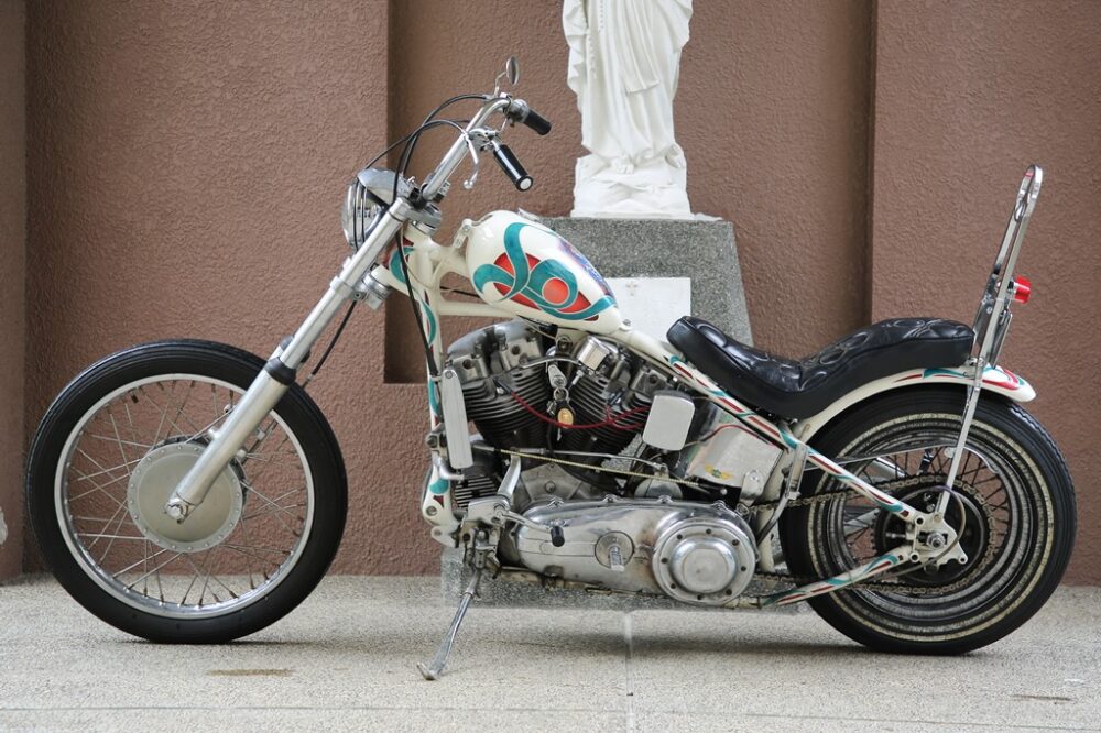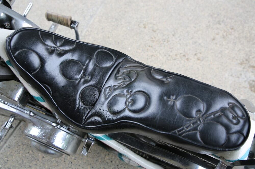 ’70sのチョッパーシートは、まるで模様のようなステッチワークが特徴的。ミッドコントロールなので座ると自然な位置にステップがある。