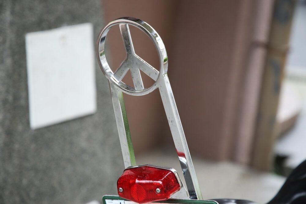 ピースマークが施されたシッシーバーはヴィンテージのパーツ。フラワームーブメントに多大な影響を受けた加藤さんらしいセレクトだ。