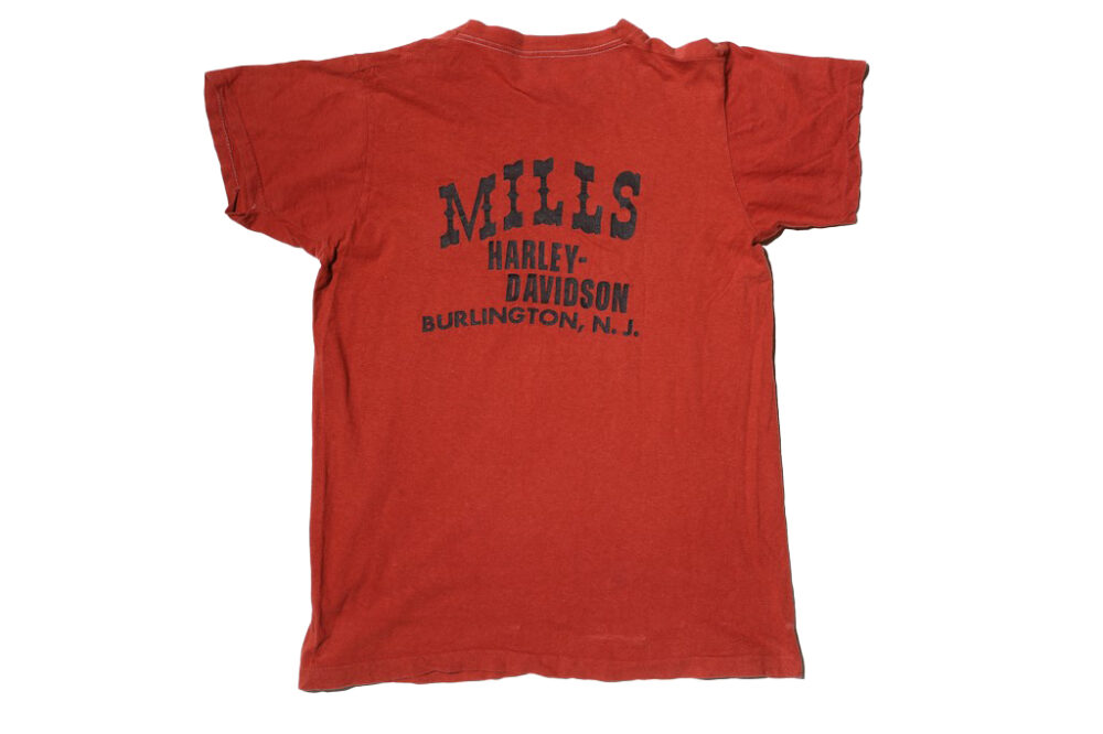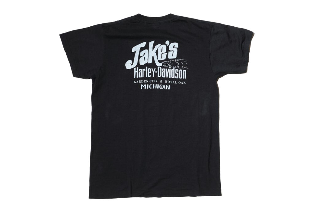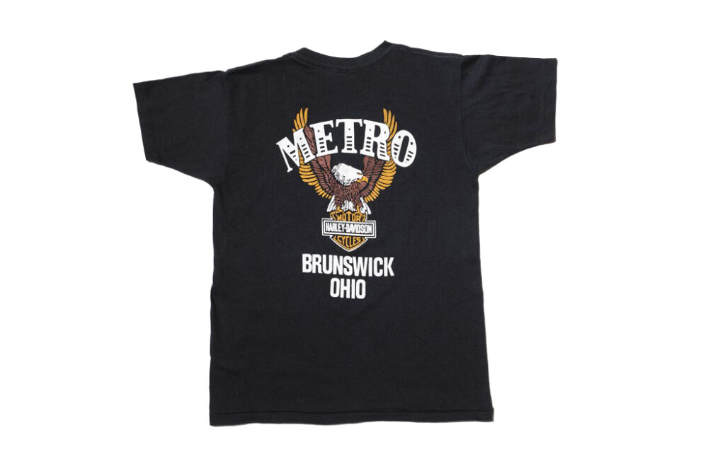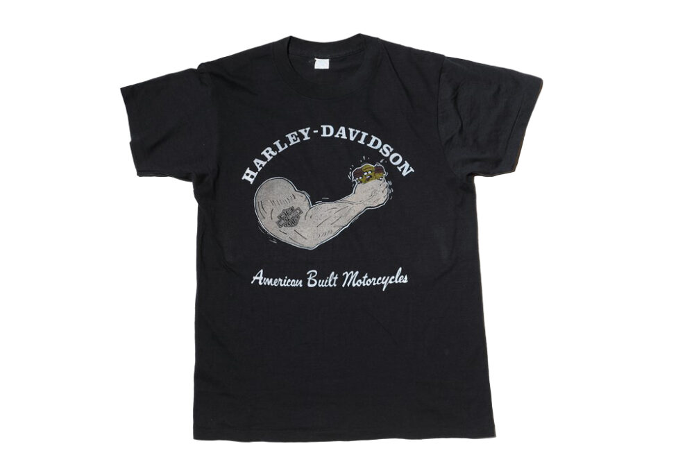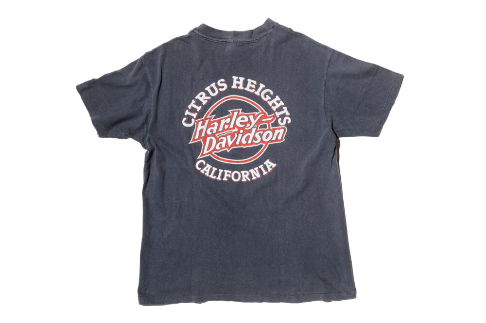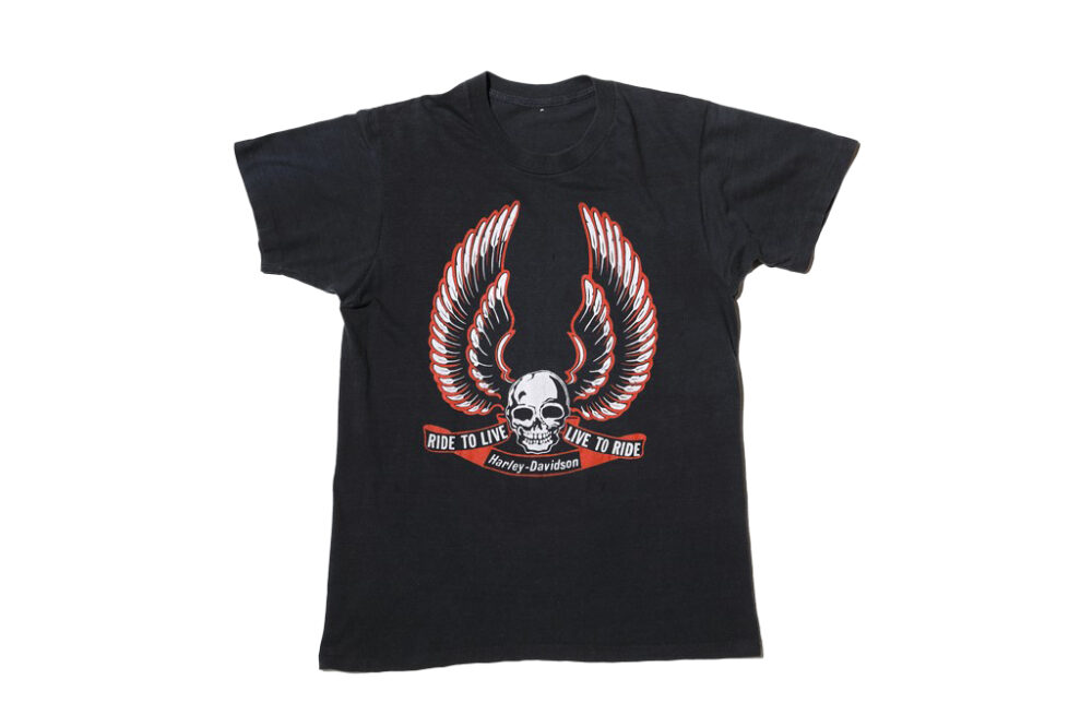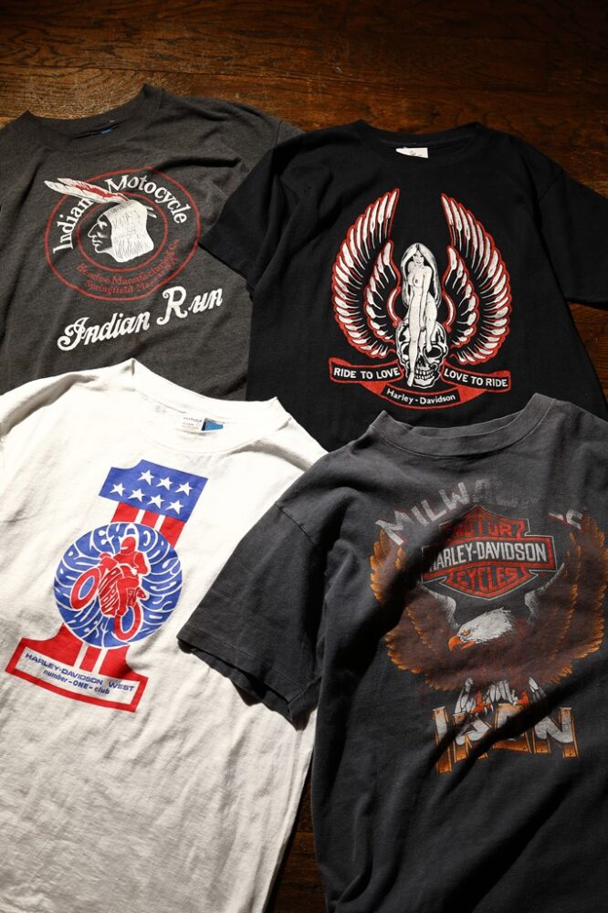 「近年の’90sブームやオーバーサイズシルエットのトレンドもあって、今まではレギュラー扱いだった’90年代のものでも人気が出てきています。日本ではそこまで人気はありませんが、海外ではハーレーの3Dエンブレムと呼ばれるプリントがものすごく高騰していたり、以前とは違う流れがあるのも事実です。でもメインとなるのは’80s以前のプリントがかっこいいヴィンテージTですね。’90年代になるとメーカー側から規制が入り、似たようなデザインが多くなりますが、それ以前はスカルフライトのように過激だったり、アウトローを匂わせるようなディーラーのオリジナルが存在します。今っぽいものもよいですが、大人にはその手のプリントがおすすめです」