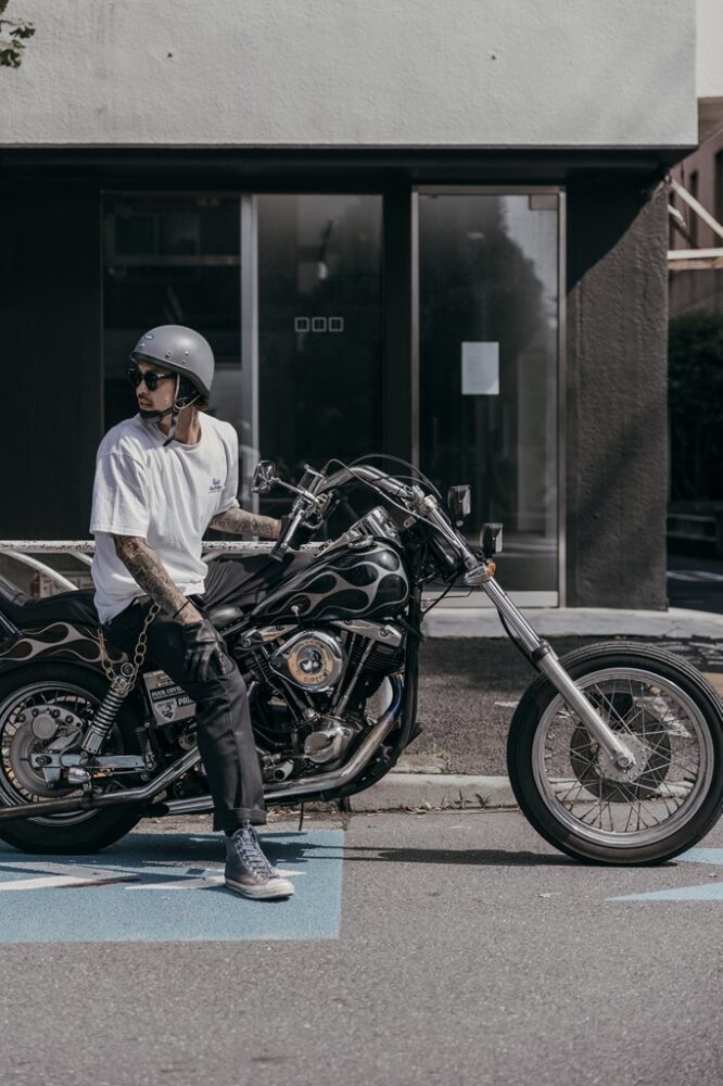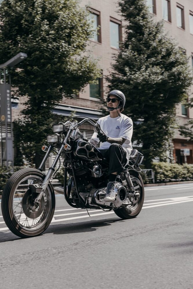 身長185㎝、イケメン、全身にブラック&グレイタトゥーを刻み、趣味はスケートボードとチョッパー、そしてカリフォルニアとカナダに在住経験有り(英語の喋りはボチボチ)。そんな才能溢れる若者が毎日原宿に通う通勤の足は’76年式FXE。十代からスケートボードに没頭してきたおかげで、西海岸の文化を好む仲間や先輩が多く、チョッパーに憧れを抱くのは必然だったようだ。