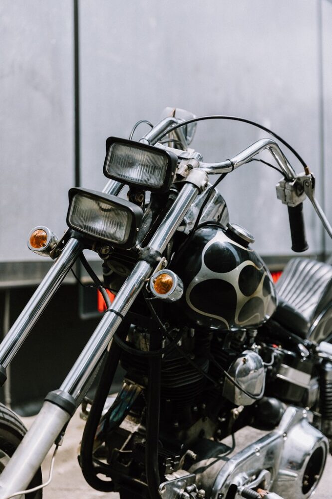 6インチオーバーのナローグライドフォークは操作性を損なわないギリギリの長さのロングフォーク。’70sの象徴的なディテールである2連スクエアライトをブラックで塗装。