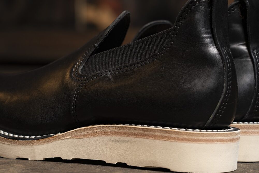6ozの厚みのある馬革の表情の変化も楽しみだ。後ろ半分のみミッドソールを重ねるハーフスリップにすることで履き心地も抜群。