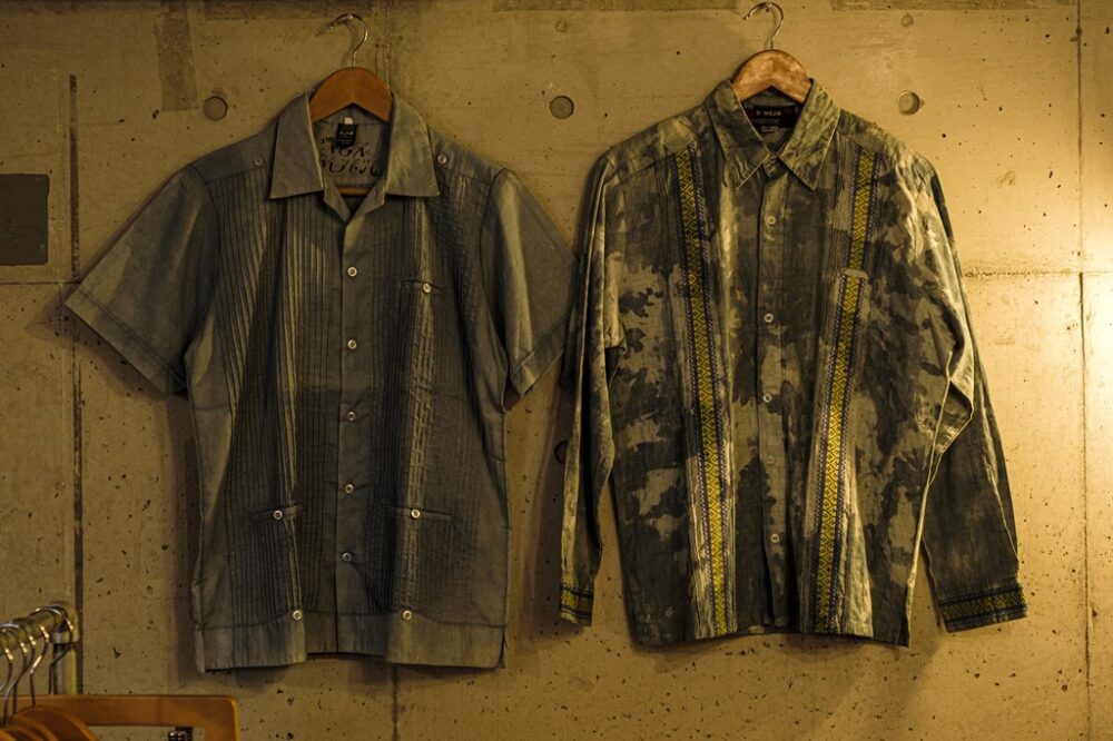メキシコから仕入れたIMPORT GUAYABERAを琉球藍で藍染している藍染めしたシャツ。ムラ感のあるタイダイ模様によって唯一無二のデザインへ再構築されている。