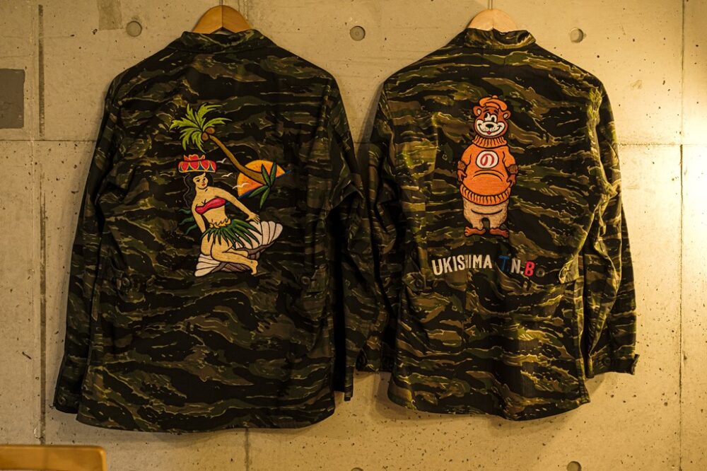 タイガーストライプのファティーグジャケットに、コザの刺しゅう店で横振刺しゅうにてデザインした刺しゅうを施したオリジナルアイテムになっている。4万2000円