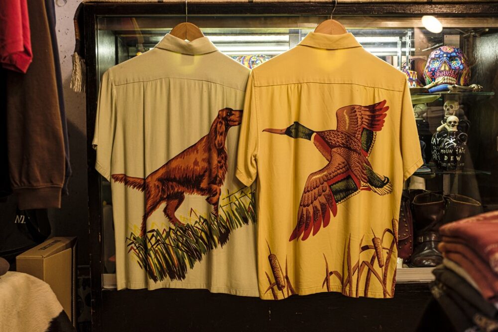大胆なバックパネルがデザインされたヴィンテージのオープンカラーシャツ。背面には鴨と猟犬の意匠をあしらっている。左/ 8万5000円、右/ 7万2000円