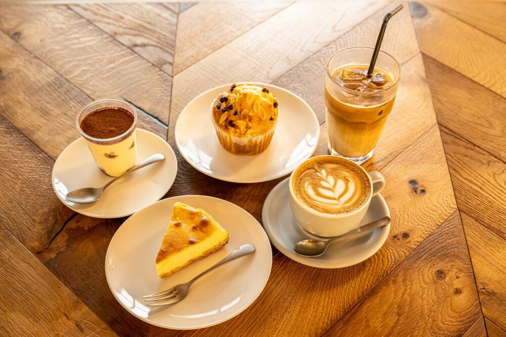 スイーツはチーズケーキやティラミスなど数種類を用意。夏に欠かせないアイスラテと、泡が少なくコーヒーフレーバーがより深く感じられるフラットホワイトはお店のオススメ。アイスラテ 850円、フラットホワイト 750円