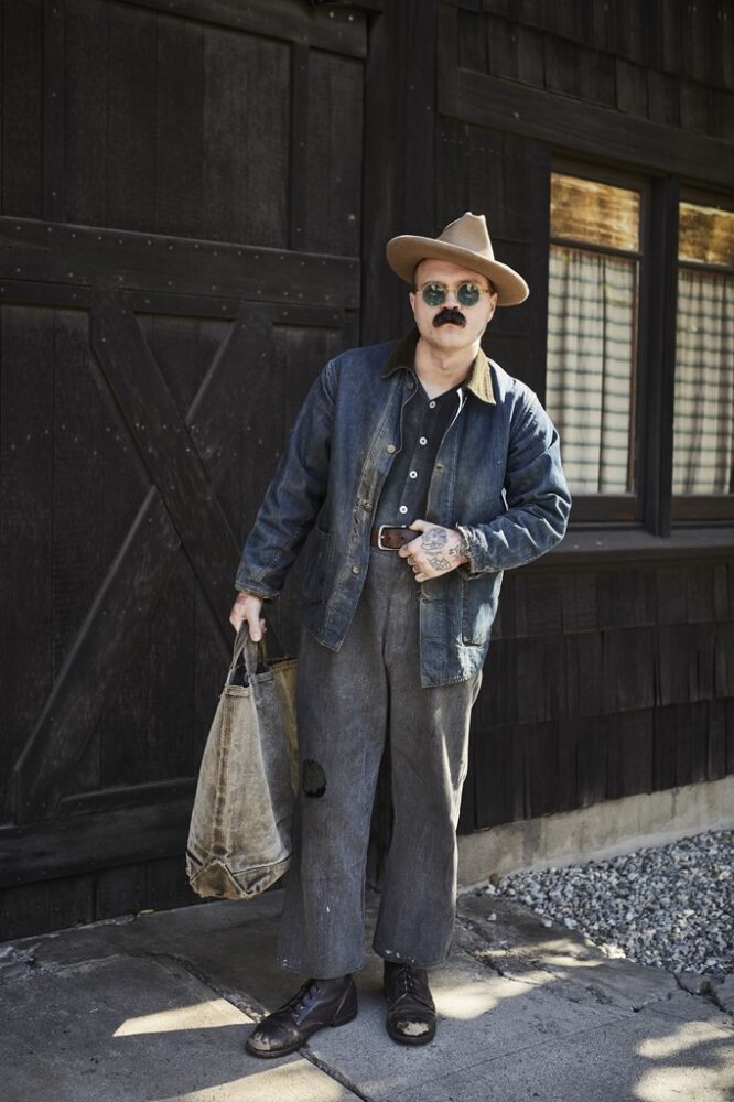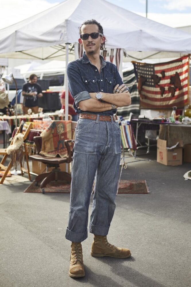 1960年代のリーバイス[501(Big E)]、いわゆるタイプ物と呼ばれるヴィンテージデニムはビッグサイズでサスペンダーを使用して着用。ゆったりとしたシルエットがお気に入り。トップスにヴィンテージデニムジャケットの中でも随一の人気を誇るリーバイス[507XX]、通称セカンドを着用し、襟にシルバーアクセサリーを装着することでアクセントを付けた。