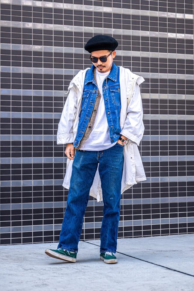 着用3年目となる1本は自社を代表するストレートモデル。この日は襟をカットしてワッペンでカスタムしたお気に入りの自社のデニムジャケットに足元はローファー、頭にはベレー帽を合わせた、キレイめながらパンキッシュなコーデだ。