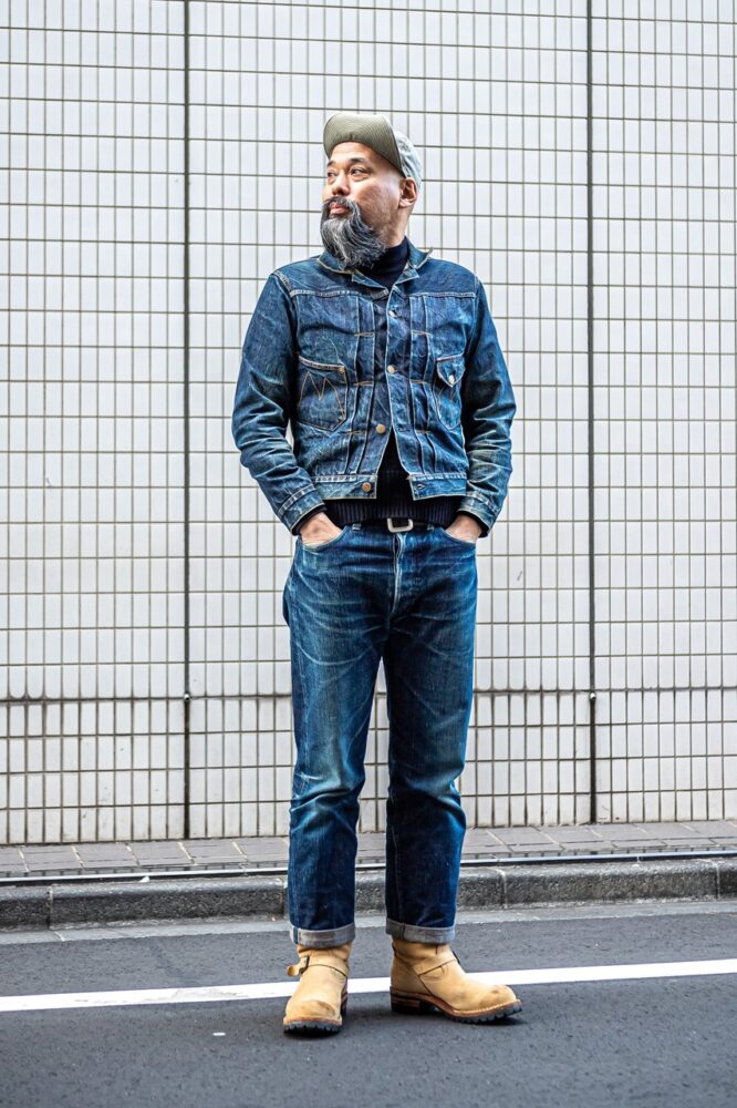 デニムは基本的にはセットアップで着用することが多いという西さんは、ジャケット、パンツ共にミスターフリーダムの同年代のアイテムをセレクト。このデニムは砂糖黍とコットン50%ずつ使用した琉球藍混生地で、荒々しく男っぽい色落ちになるのでオススメとのこと。ジャケット、デニム共に5年程度の着用で、洗濯をし過ぎないことが色のメリハリに繋がると思います。