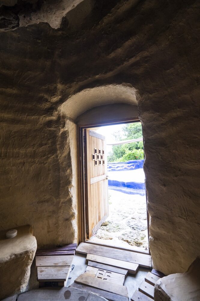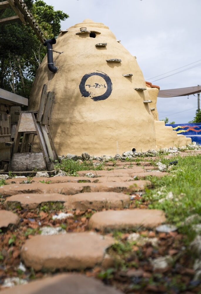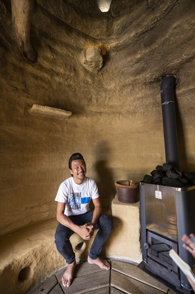 それがゴーミーだ。外国人ハウスだった建物を大工チームがリノベーションして、カフェとバーは飲食チームが担当。ここでイベントを開催することも少なくないため広報チームもいる。そして世界初のアースバッグサウナは、ここの一番のウリでもある。耐熱耐久性に優れたアースバッグは、一度サウナストーブに火を入れたら火が逃げない構造。ロウリュの水蒸気が対流を生み、発汗機能がとても高いのが特徴だ。木々が生い茂る大自然の中、海が見渡せる展望台もあり、自然と一体化したかのような癒やしの時間がここにはあるのだ。