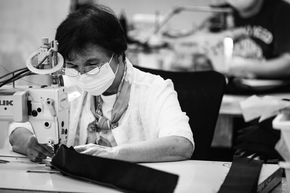 縫製工場というと、その労働力を外国人労働者に頼っている工場が多いが、このコロナ禍で皆帰国してしまい、事実上の閉鎖に追い込まれた工場も少なくない。しかしここで働いているのは、みなさん地元で生まれた方ばかり。そのため、コロナ禍という未曽有の事態に陥っても、普段と何ら変わることなく、生産を続けられているという。食事時になると、笑い声がそこかしこから聞こえるほど、工場内はアットホームな雰囲気。
