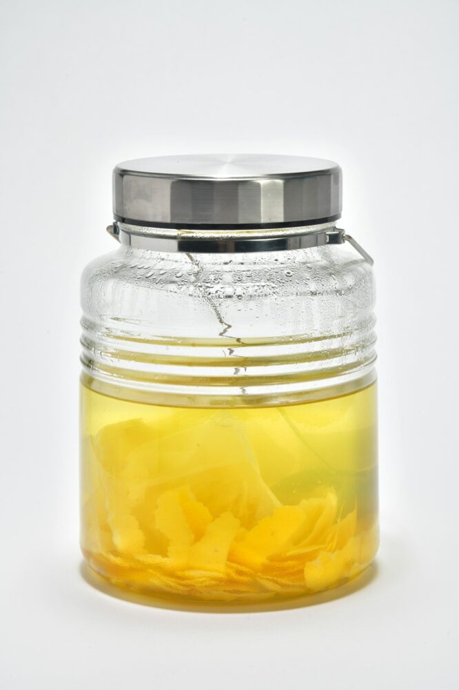 容器にレモンの皮を入れて漬け込む。小さくむけた皮は、お茶パックにまとめて入れて漬けておけば、焼酎をすくうときに紛れることがない。またレモンの風味をより出したい場合は、少し果汁を搾って加えるのもアリ!