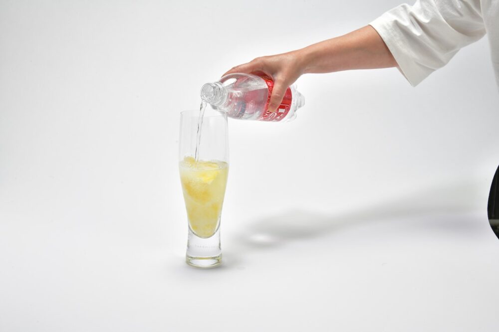 ソーダを入れる。勢いよく入れると炭酸が抜けてしまうので、優しく入れる。