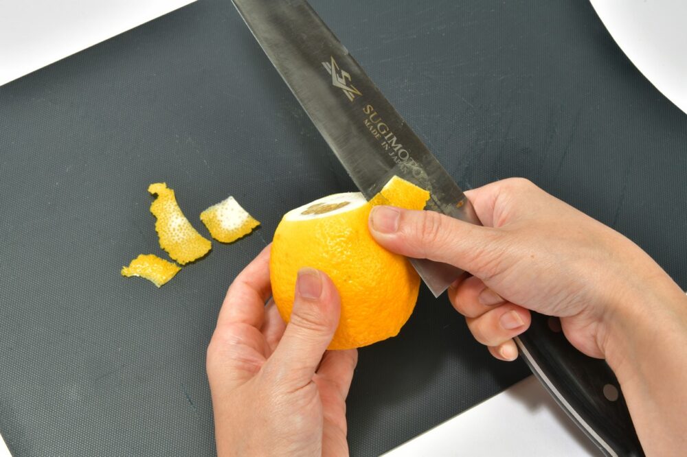 焼酎に漬け込むのはレモンの皮のみ。レモンの皮と実の間にある白いワタにはエグ味があるので、皮をむくときは白いワタを取り除くようにする。