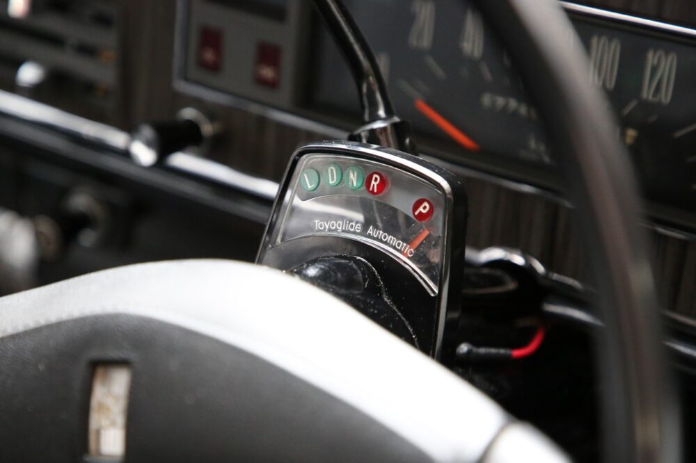 この個体の特徴のひとつが変速機。トヨタの開発した日本初のトルクコンバータ付きオートマチックトランスミッション、トヨグライドを搭載しているのだ。走行は2速ギアで行い、道路条件に応じて手動で1速にシフトする2速半自動オートマチックだ。