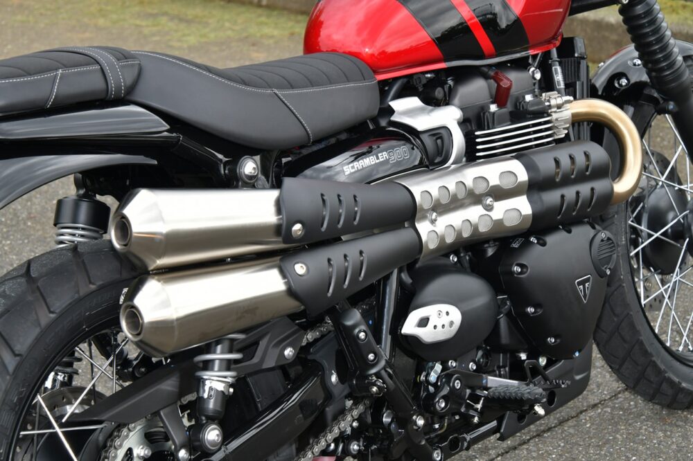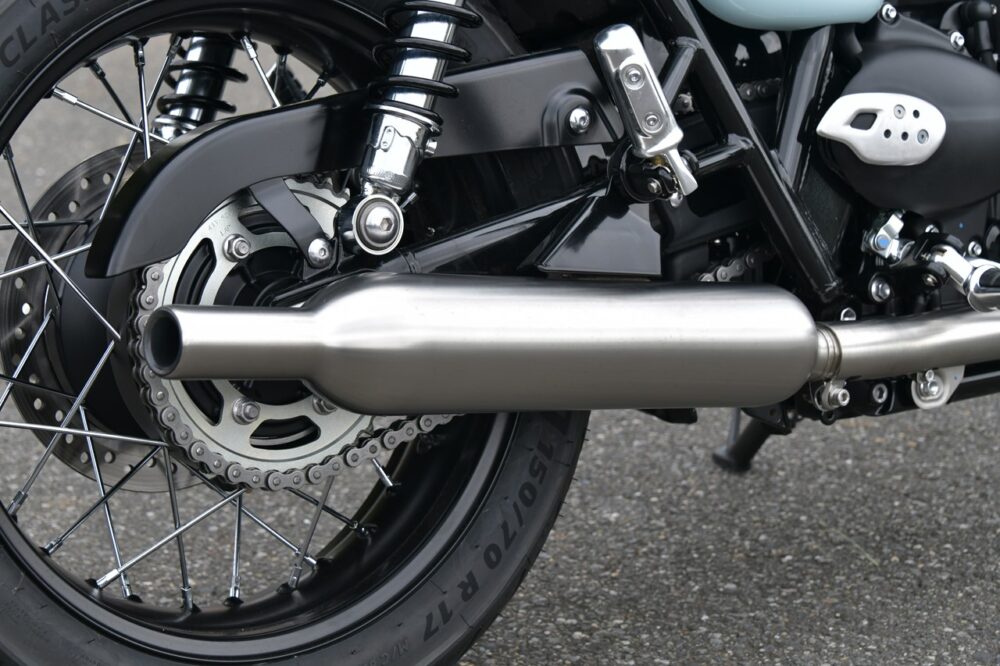 歯切れのいい音を奏でるサイド2本出しのアップマフラー。足への熱が気になるが厚手のパンツを穿けば問題ない。