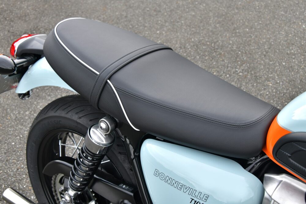 座り心地のいいデュアルシート。ロングライドでもお尻が痛くならない。シート下にはUSB電源ソケットを装備。
