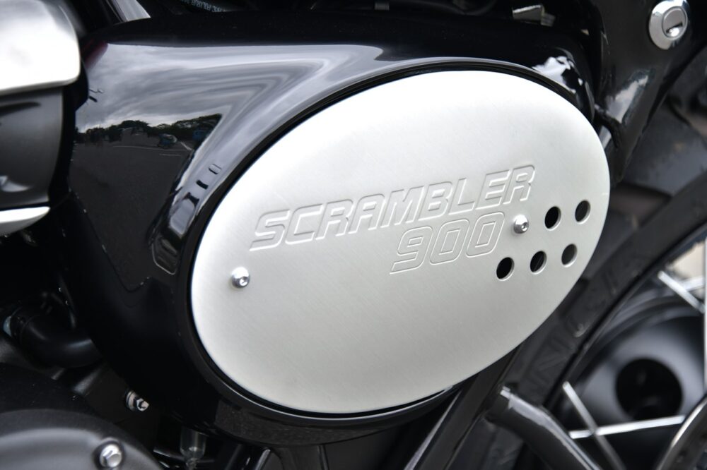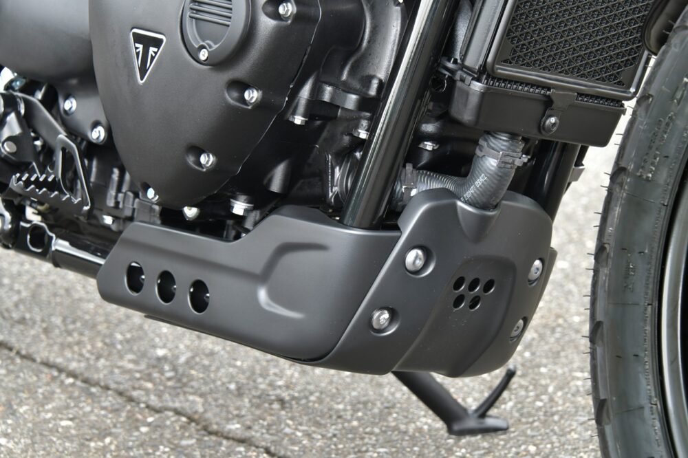 ダート走行中の飛び石などからエンジンを守るアルミ製アンダーガード。スクランブラーならではの装備のひとつ。
