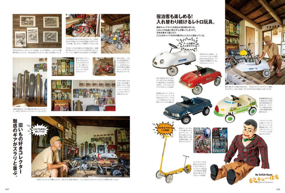 高度成長期に幼少期を過ごした中根丈彦さんは、当時の子どもに夢を与えてくれる玩具に心を奪われた健全な少年でした。当時の玩具は大人になっても憧れであり夢です。ペダルカーを含む当時の玩具を木造の納屋スタイルの趣味空間に詰め込みました。