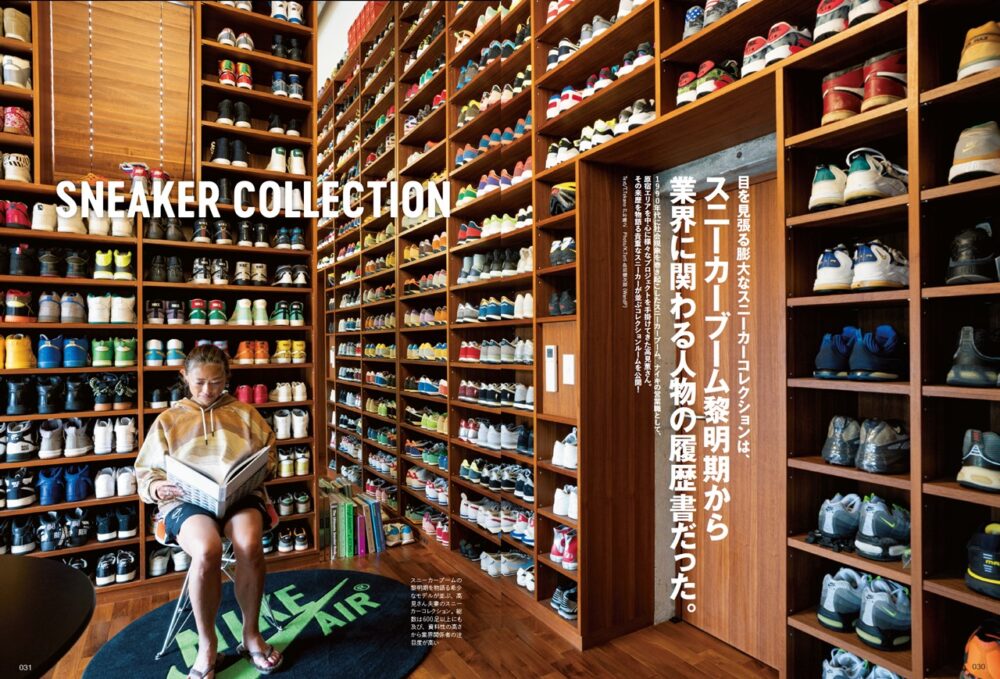 壁一面にきれいに並べられたスニーカーコレクション。1990年代に社会現象を起こしたスニカーブーム時、内規の営業職として原宿エリアを中心に様々なプロジェクトを手がけてきた高見薫さんのコレクションルーム。ここから伝わるのんは、業界に関わる人の履歴書です。
