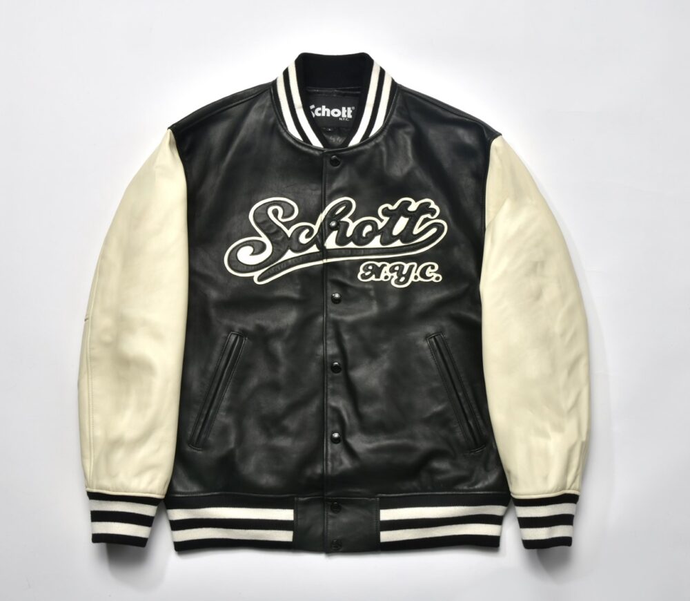 柔らかくて軽い着心地のシープスキンを使用したオールレザーのスタジャン。胸にはSchott N.Y.C.のレタードが入り、カレッジ気分を盛り上げる。カジュアルながら、どこかハードさを残したレザーならではの佇まいが魅力。7万9200円