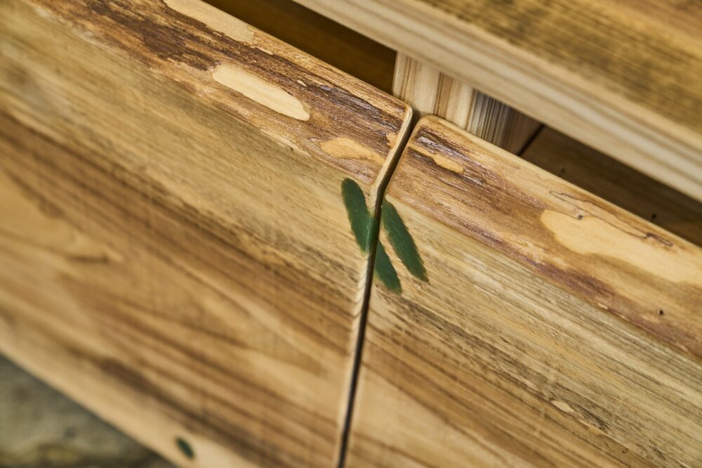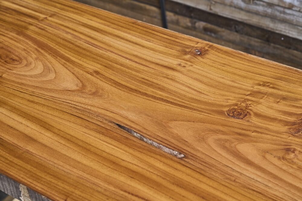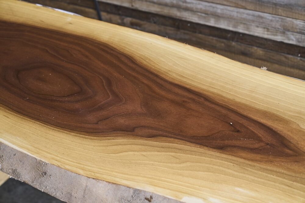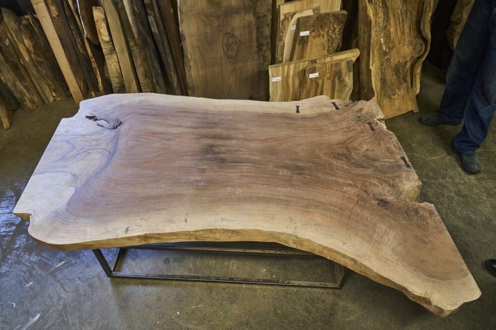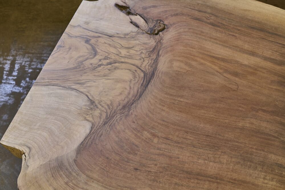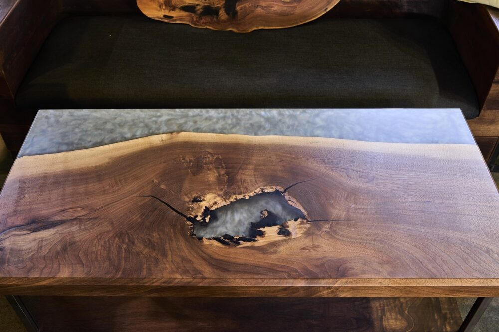 木の節目やクラックをレジン(樹脂)で埋めるのもおすすめ。こちらはブラックウォールナットの節目をレジンで埋めたテーブル。