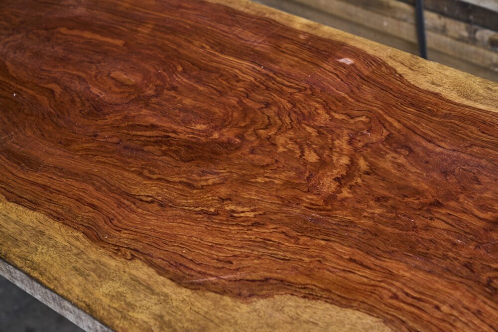 アフリカの木材「ブビンガ」で作ったテーブル。非常に硬く、赤褐色に輝く。現在では輸入禁止となっている。