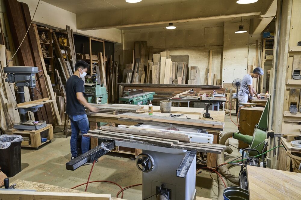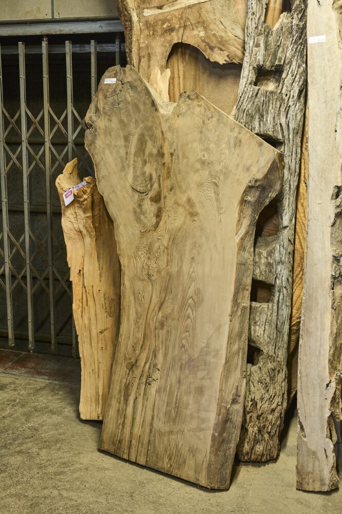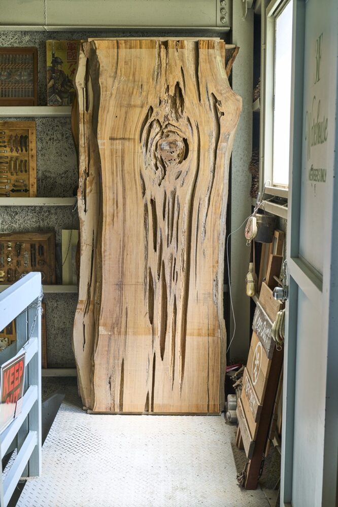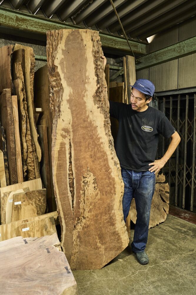 ティープラスターでは、木材の販売を行うほか、オリジナル家具の製作やリノベーション、設計・施工まで幅広く行うが、ここにあるレアな木材を求めて、材木のプロたちも買いに来るほど。ティープラスターのファクトリー兼ショールームを見て驚いた。そこかしこに材木が置かれ、中には超希少な木材もストックしている。すべて、水口さんが自分の足で日本や世界を回って集めてきたものだ。