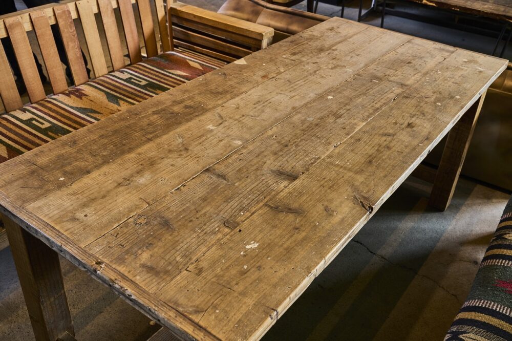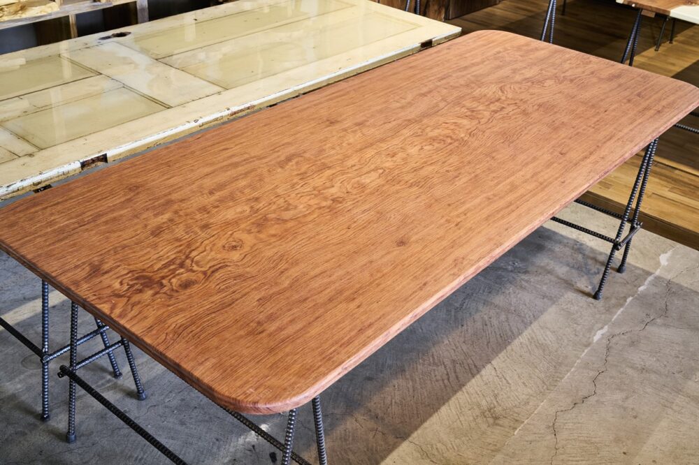 足場材などでよく使われる杉の古材を使ったテーブル。この乾いた感じが人気を呼んでいる。「床材に使ってもカッコいいですよ」。
