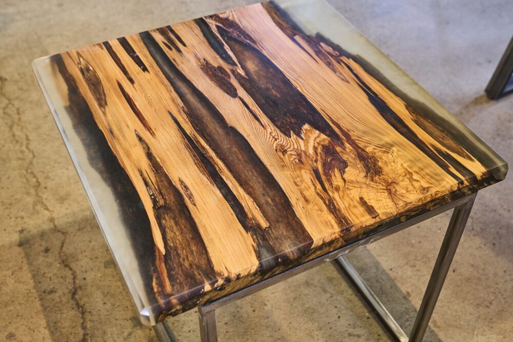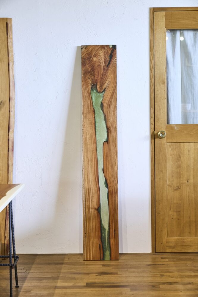 木とレジンの組み合わせ方は、それこそ無限。テーブルやドア、オブジェなどにも使える。お手持ちの木を持ち込んで、レジンで加工してもらうことも相談可能。