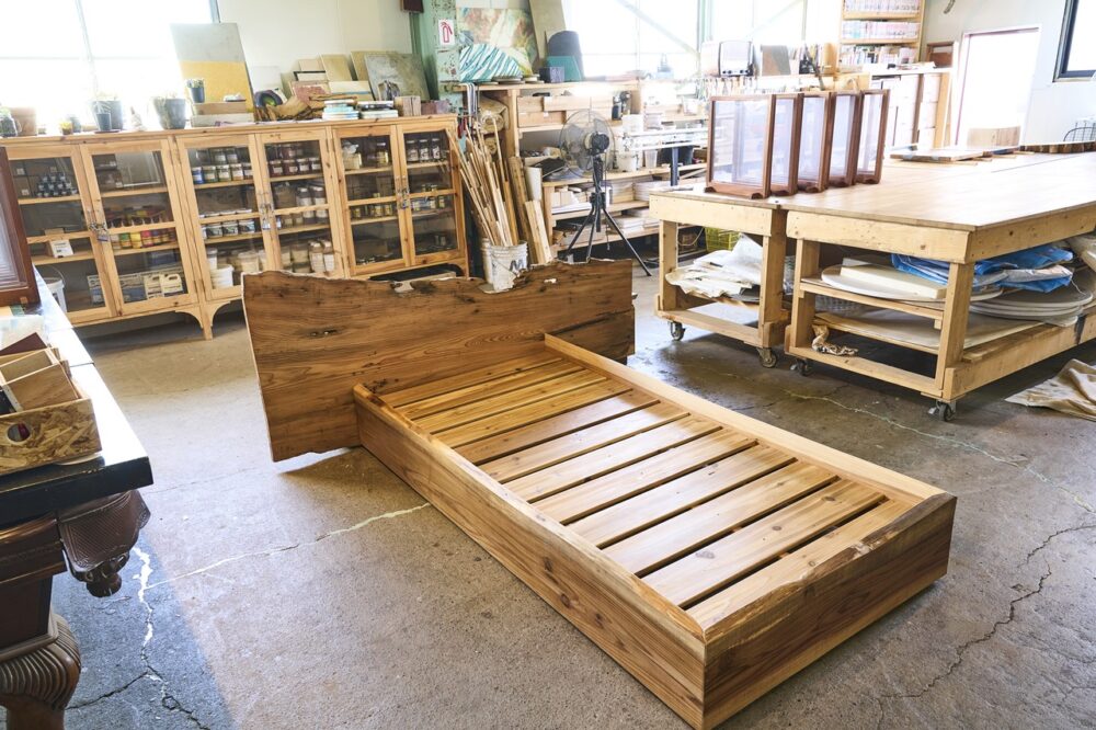 現在製作途中のベッド。床板に屋久島の地杉を使い、ヘッドボードには屋久杉を使用。「いろんな森に行きましたが、屋久島は別格です。このベッドで寝たら、屋久島のパワーをもらえますよ」と水口さん。
