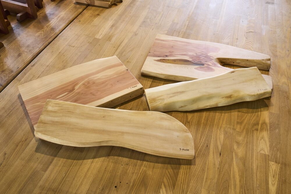 木の風合いを生かした皿。上の2つがケヤキ科のカイヅカイブキ、下の2つはパイオニアツリーを使用。工芸品のように美しい。