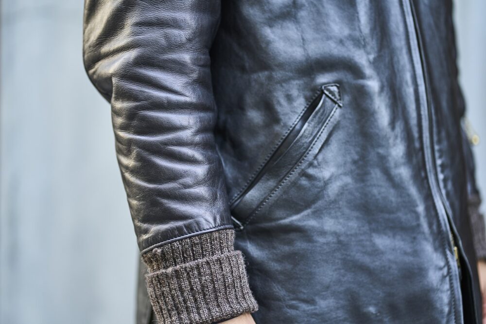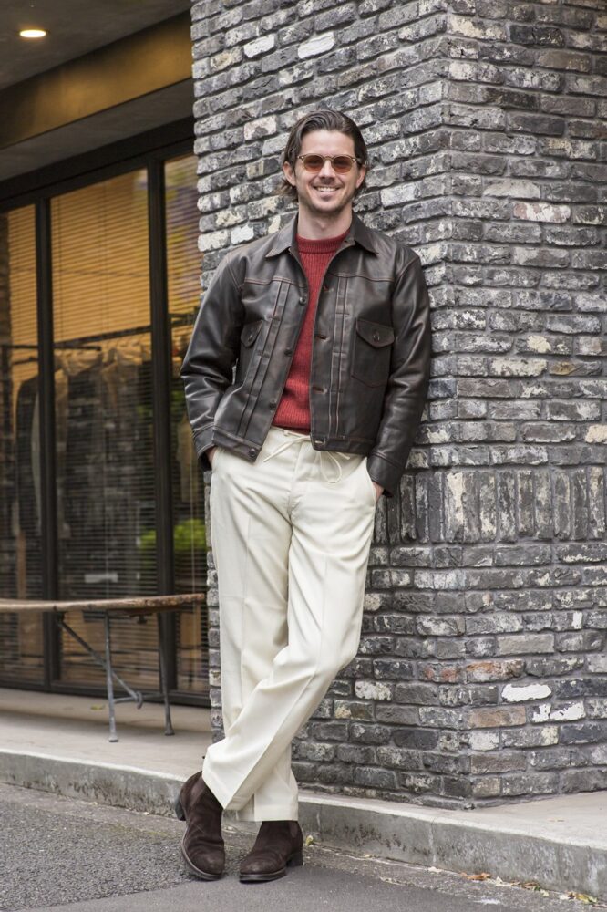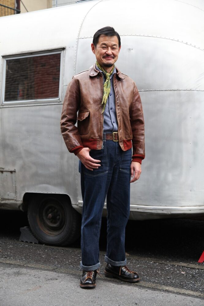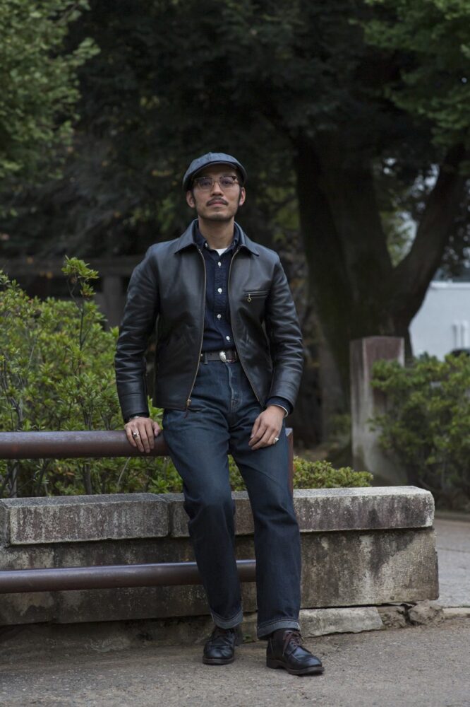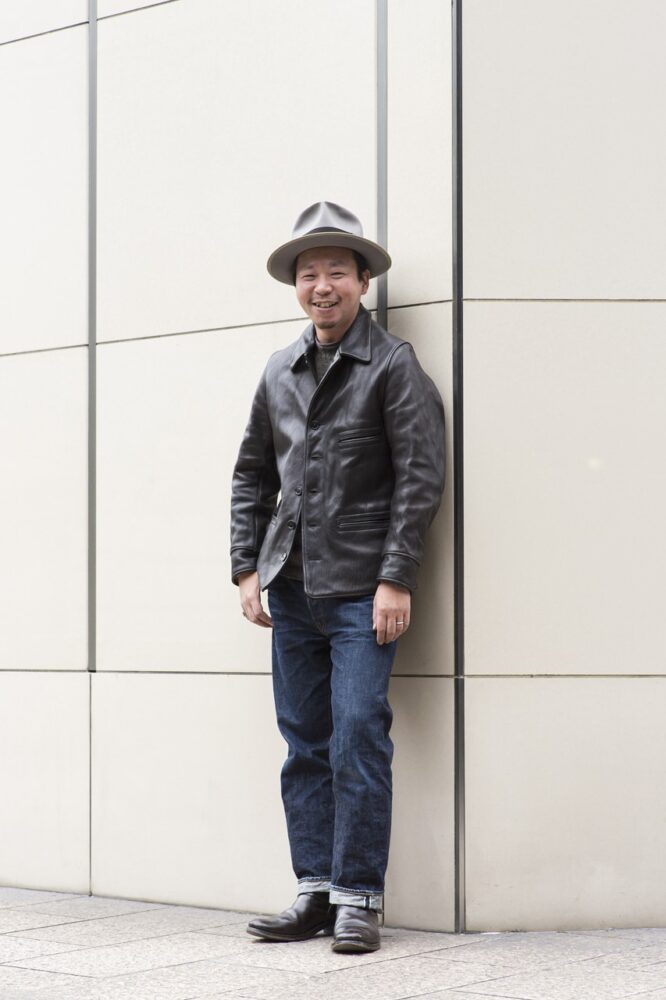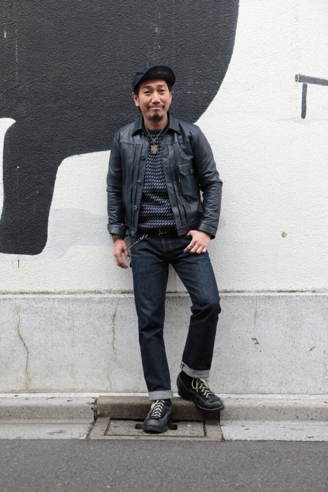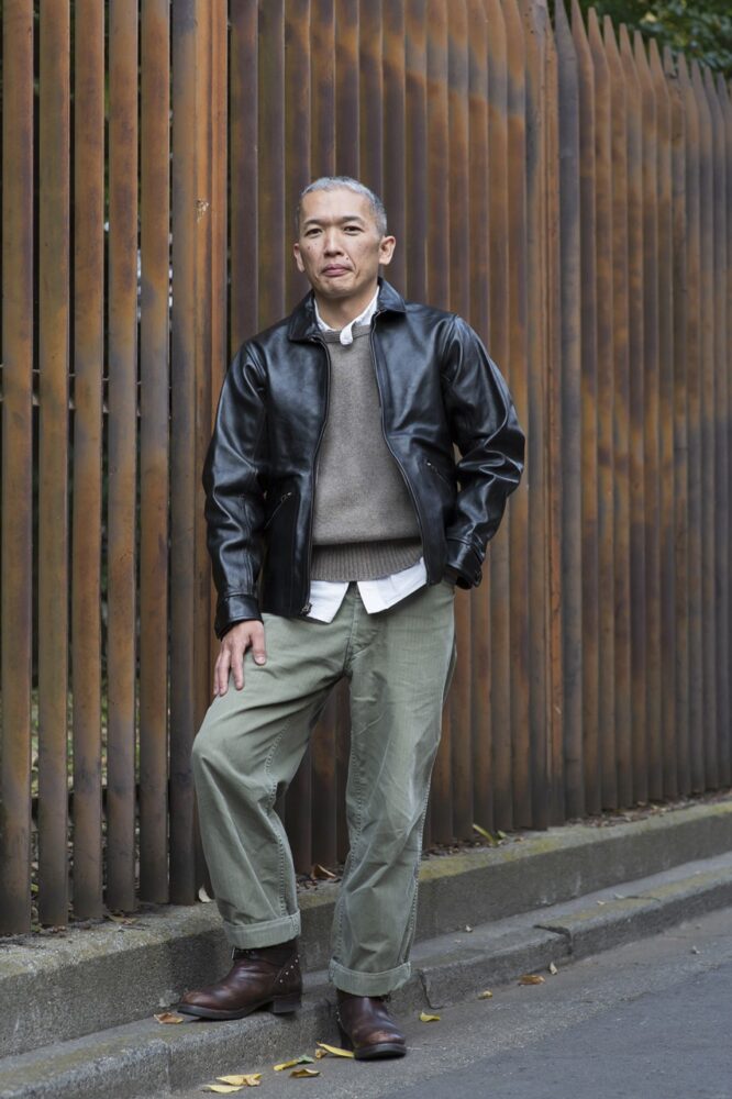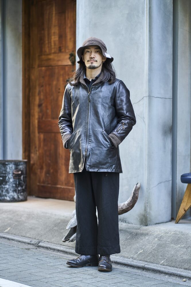 アジの出た天神ワークスのJC01カークラブジャケットを無造作に羽織り、大ぶりなレザーアウターながら抜け感のあるスタイルを見せてくれた安藤さん。天神ワークスのカラーレザーは、色止めをしていないために経年で褪色していく。そんな色のコントラストが楽しめるのも天神の魅力だ。