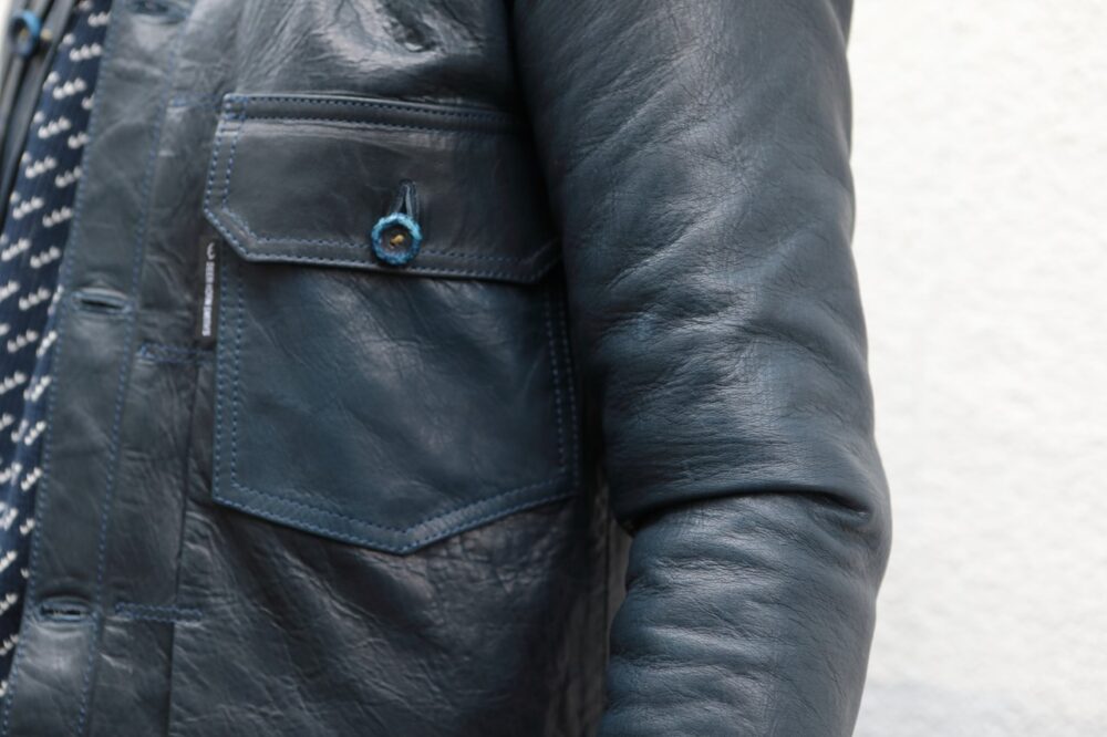 ハミングバーズヒルショップとディアホーンスミスズとのコラボレーションで作られたレザージャケット。いわゆる1stタイプのデザインでエゾ鹿の革をインディゴ染めしたもの。「インディゴ染めのレザーに蝦夷鹿のツノを加工したボタンがアクセントとなっています」